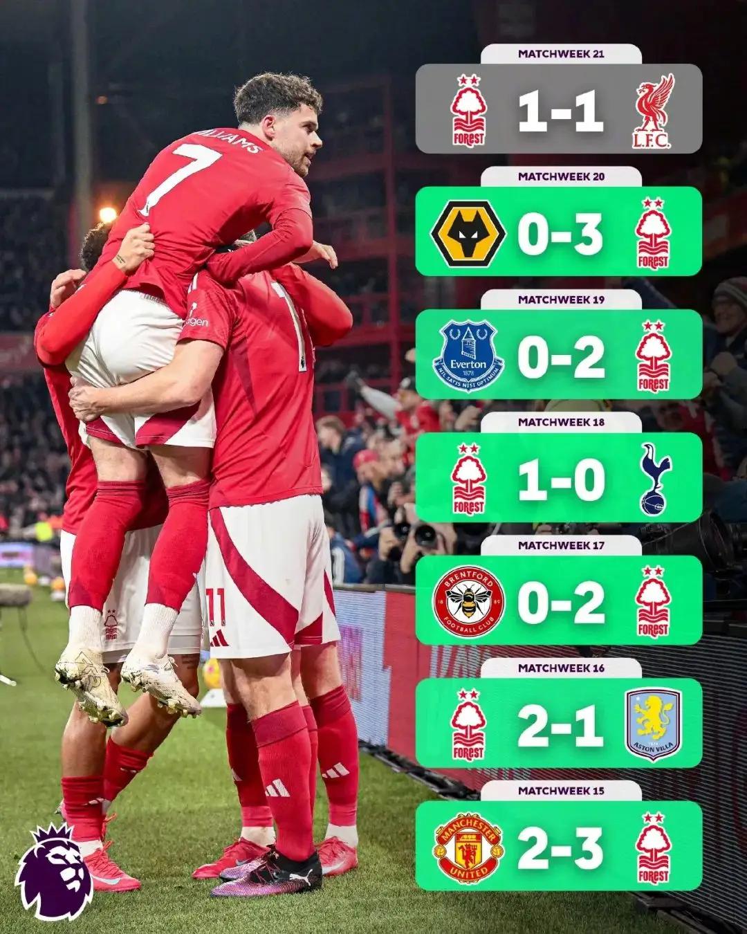 本场比赛前,森林在0-3输给曼城后,先后3-2曼联、2-1维拉、2-0布伦特福德、1-0热刺、2-0埃弗顿、3-0狼队、2-0卢顿,各项赛事取得7连胜,本轮平局连胜宣告终结,但本赛季对红军1胜1平拿到4分。