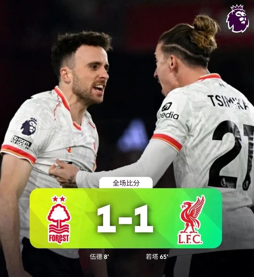开场8分钟,埃兰加助攻伍德进球,利物浦上半场9次射门0射正。下半场66分钟若塔替补登场,第一次触球就头球扳平。森林门将塞尔斯多次救险,最终利物浦客场1-1战平森林。