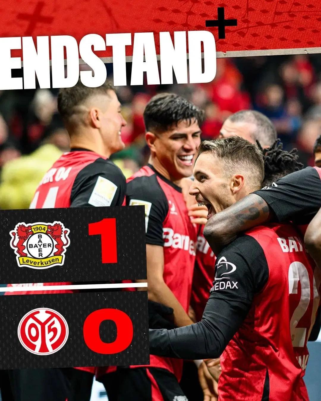 直播吧01月15日讯 德甲第17轮,勒沃库森1-0击败美因茨,豪取德甲7连胜,多赛一轮只落后榜首的拜仁1分。