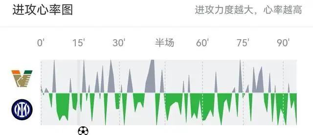 下半场比赛中,国米的控球率提高了13个百分点,达到了65%。然而,他们的射门次数却不到上半场的一半,不过进攻效率却显著提高,仅5次射门便有2次命中目标,并创造了两次得分机会。相比之下,威尼斯队同样在下半场完成了5次射门,其中有2次打正。尤其从70分钟后,随着国米球员体能下降,威尼斯队逐渐找到了进攻的节奏,两次最佳的得分机会都在此阶段出现。进攻心率图显示,这一变化十分明显。