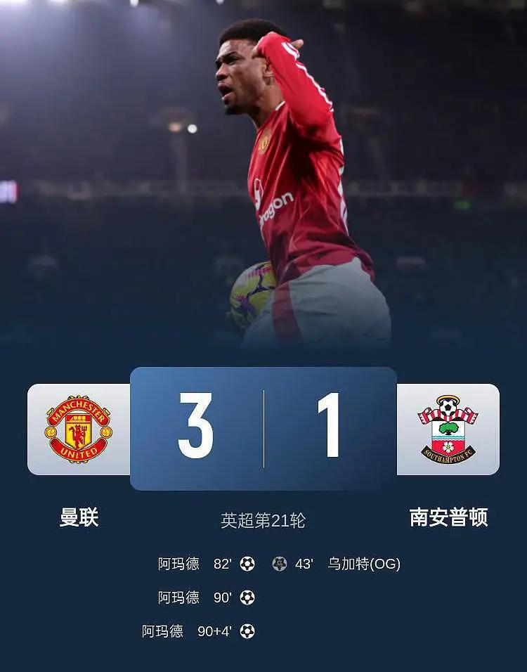 第90+4分钟,阿玛德再进一球!曼联3-1领先。