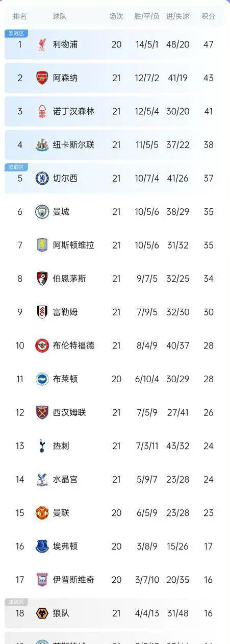 最新积分榜显示,领头羊利物浦以47分稳居榜首,但仅领先阿森纳4分,争冠形势再度变幻莫测。紧随其后的诺丁汉森林以41分坐稳第三,而纽卡斯尔以38分上升至第四。切尔西以37分排名第五,而曼城和维拉同积35分,分列第六和第七;伯恩茅斯以34分位列第八,争四形势陷入混乱。