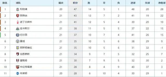 本赛季的英超比赛中,卫冕冠军曼城的表现出现下滑,目前只积35分,排名第6。与此形成鲜明对比的是,利物浦状态出色,以47分高居榜首位置。然而,在北京时间1月16日,英超积分榜再次发生变化,阿森纳在一场大战中以2-1战胜热刺,他们在5场比赛中取得了4场胜利,总积分达到43分,成功升至第2位,与领头羊利物浦仅相差4分,争夺冠军的悬念再度升温。同时,新贵纽卡斯尔联在另一场胜利之后,反超切尔西,登上第4位;而曾经的英超冠军莱斯特城则遭遇6连败,最近一场0-2不敌水晶宫,持续处于降级区。