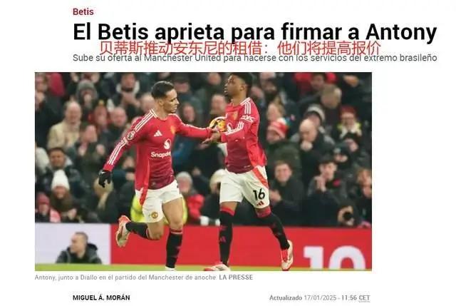去年12月,贝蒂斯就联系曼联,商讨安东尼的租借,12月底,贝蒂斯就送上报价,希望在冬窗租借安东尼。曼联愿意租借安东尼,但希望贝蒂斯提高租借费,多承担一些工资。西媒透露,贝蒂斯准备送上第2份报价,希望尽快完成安东尼的租借。