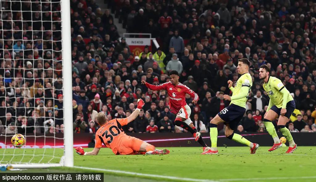 第94分钟,曼联锁定胜局,这一次依旧是阿玛德的进球。南安普顿后场倒脚出现失误,彼得斯停球稍大被身后高速上抢的阿玛德断球,后者轻松推射空门得手上演帽子戏法。
