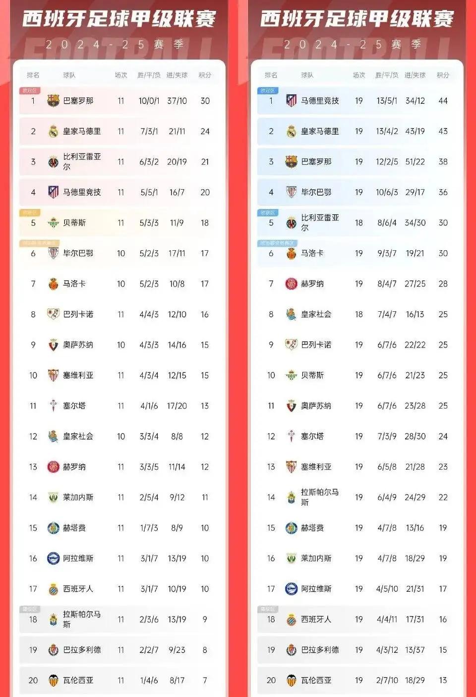 凭借近两个多月的出色状态,西蒙尼的球队在上轮击败奥萨苏纳后登顶西甲榜首,19轮13胜5平1负,积44分。
