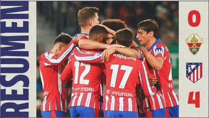 最终马竞4-0大胜埃尔切,晋级国王杯8强,各项赛事达成15连胜,继续刷新队史最长连胜纪录。他们下一场比赛将是周末西甲客场对阵莱加内斯。