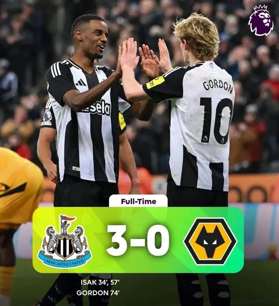 英超第21轮,纽卡斯尔坐镇圣詹姆斯公园3-0横扫狼队,伊萨克梅开二度,并助攻安东尼-戈登锁定胜局,喜鹊取得各项赛事9连胜。