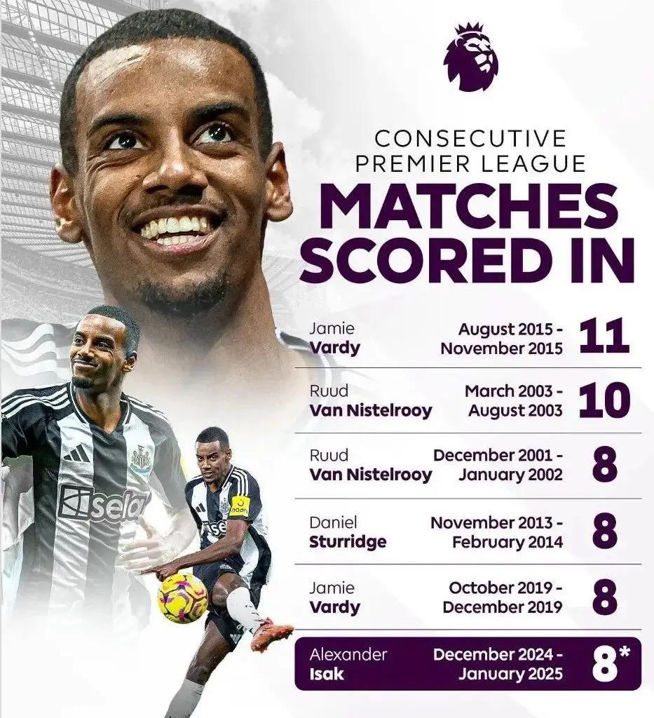 自第14轮3-3平利物浦的比赛开始,伊萨克连续8轮英超进球,一共打进11球。英超连续进球场次纪录由瓦尔迪在2015年创造,蓝狐传奇连续11场进球。