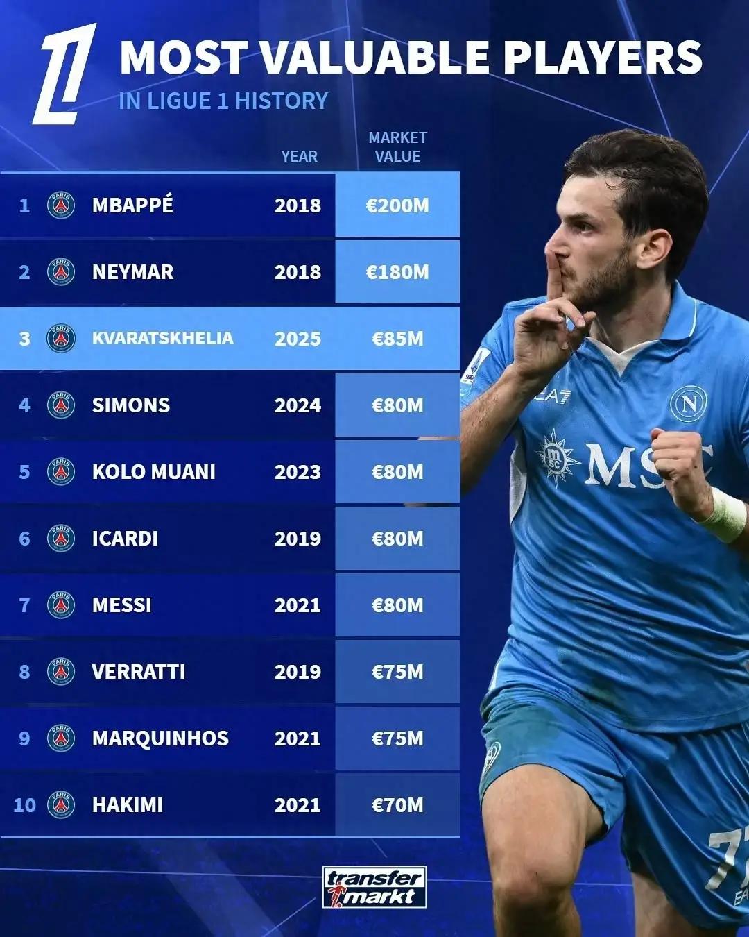 法甲历史前十身价榜单: