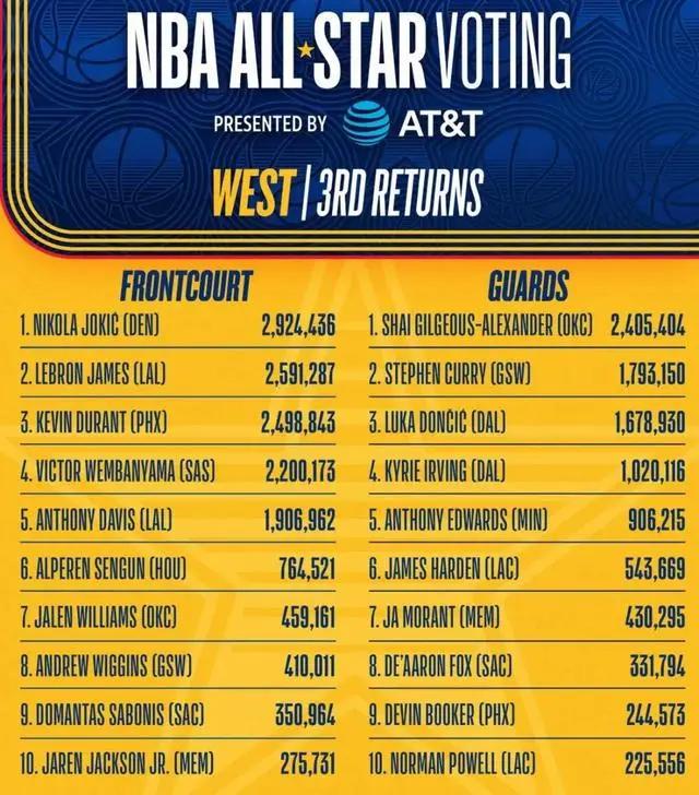 北京时间今天,NBA官方发布了2025年全明星周末第三阶段球迷投票结果。密尔沃基雄鹿的阿德托昆博以348万9956票高居榜首,丹佛掘金的约基奇则以292万4436票领先西部其他球员。