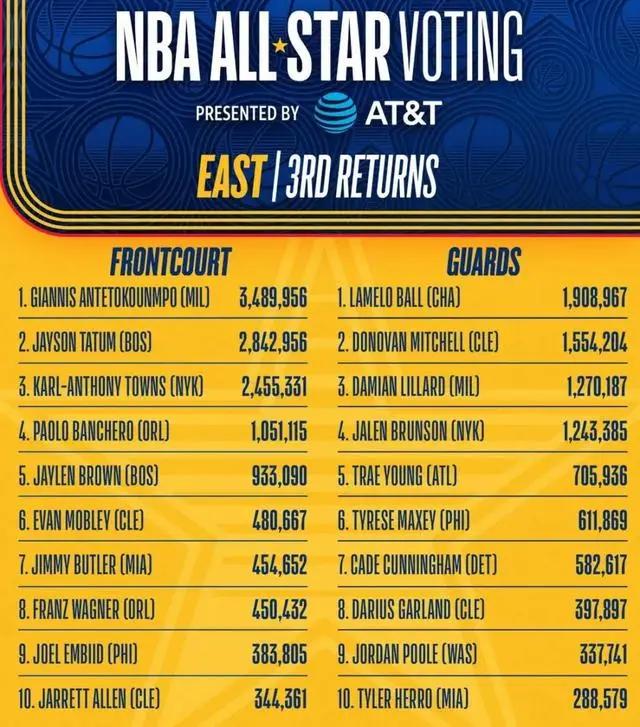 东西部得票前三的前场和前二的后场球员将成全明星赛首发。东部方面,字母哥、塔图姆和唐斯是前场前三;后场方面,拉梅洛·鲍尔领先,米切尔和利拉德紧随其后。西部方面,约基奇是前场票王,勒布朗·詹姆斯超越杜兰特排名第二;后场方面,亚历山大第一,库里和东契奇位列二三。