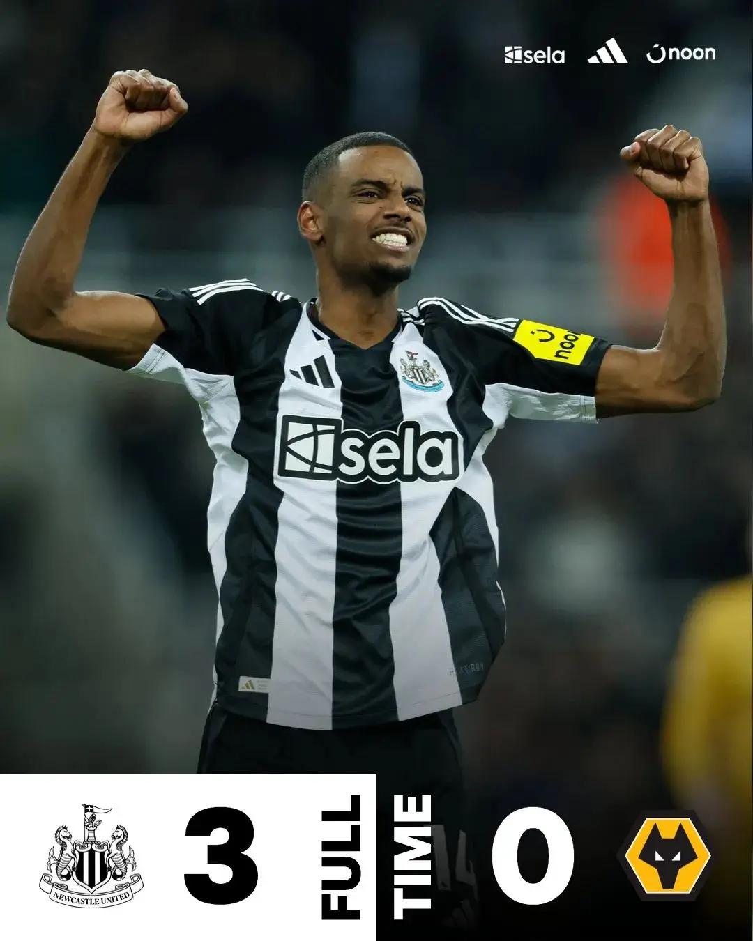 纽卡斯尔联在本周三的英超联赛中主场3-0大胜降级区的狼队取得六连胜,他们在英超、联赛杯和足总杯中取得九连胜。纽卡斯尔联在比赛中展现了强大的控制力,全场比赛几乎都对狼队保持压制。伊萨克、戈登和墨菲的三叉戟对狼队球门构成了巨大威胁,伊萨克一手导演了第一个进球后接到戈登的助攻梅开二度,比赛结束前他投桃报李助攻戈登轻松破门,纽卡斯尔联获胜后排名升至第四,目前落后利物浦九分。阿兰希勒表示这支喜鹊已经具备了夺冠的实力。如果纽卡斯尔联本场比赛获胜,他们将创造队史十连胜的新纪录,伊萨克如果进球将成为继范尼斯特鲁伊和瓦尔迪后第三位连续九场英超进球的球员。