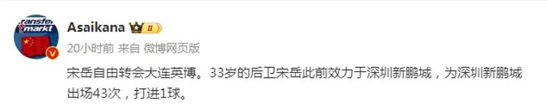 去年踢中超的球员,来了!1月17日,据德转信息显示,原深圳新鹏城后卫宋岳以自由身加盟大连英博。现年33岁的宋岳楞打后卫和后腰,还有一脚任意球功夫。目前宋岳德转的身价为5万欧元。宋岳为深圳新鹏城共出场43次,贡献1球+助攻1次。2023赛季中甲,宋岳帮助四川九牛夺冠,2024赛季中超,帮助新鹏城保级。