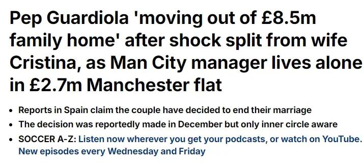到了 2016 年,命运的齿轮再次转动,瓜迪奥拉接到了来自曼城的邀约,开启了他在英超赛场的执教生涯。于是,他们又举家搬迁至英格兰。然而,生活的轨迹并非总是一帆风顺。2019 年,一个转折点悄然来临,克里斯蒂娜带着女儿瓦伦蒂娜回到了巴塞罗那。对于这一决定,外界猜测纷纷,但可以确定的是,从那时起,瓜迪奥拉与克里斯蒂娜便开始了长达 5 年的分居生活。在这 5 年里,克里斯蒂娜时常往返于英国和西班牙之间,一边要照顾女儿在巴塞罗那的生活,一边又要维系与远在曼市的瓜迪奥拉之间的情感纽带。但距离和生活的差异,还是逐渐消磨了他们之间的感情。据《每日邮报》的深入报道,瓜迪奥拉与克里斯蒂娜实际上在去年 12 月就已经秘密办理了离婚手续。这个消息在当时被严格保密,只有极少数亲近的人知晓。这一秘密的离婚过程,也让外界对他们的感情状况充满了好奇与猜测。离婚后的瓜迪奥拉,在生活上也发生了巨大的变化。作为英超年薪最高的主帅,瓜迪奥拉在巴塞罗那和曼彻斯特这两座城市都购置了房产。如今,他从巴塞罗那那座价值千万欧元的豪宅中搬出后,未来回巴塞罗那的落脚点成了一个未知数。而目前,他居住在曼彻斯特市中心的 Deansgate CitySuites 的一套公寓里。这套公寓所在的大楼十分气派,足足有 16 层高,楼内共有 237 套精心设计的一居室和二居室。公寓价值 320 万欧元,虽不及巴塞罗那的豪宅那般奢华,但也处处透露着精致与舒适。瓜迪奥拉选择在这里开启他的独居生活,似乎也在暗示着他想要与过去的生活做一个彻底的告别,全身心地投入到他所热爱的足球事业中。