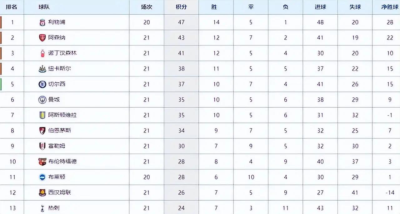 先看英超联赛,在最新的一场联赛中,利物浦客场1-1被诺丁汉森林逼平,近2场英超联赛2连平,而同时争冠对手阿森纳则连续抢分,近5场4胜1平,这样的话,在积分榜上,利物浦积47分继续排在第1,但是阿森纳积43分排在第2,双方的距离已经缩小到4分,这也让本赛季的英超冠军争夺再次出现悬念。不过,双方都有赛程密集的问题,接下来就是考验双方的稳定性了。