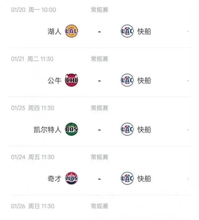 据最新报道,洛杉矶快船在击败波特兰开拓者后取得三连胜,目前战绩为23胜17负,排名西部第五,比掘金落后一场,比湖人领先一场。好消息是他们将迎来连续五个主场,但赛程紧张,包括两次背靠背比赛,在七天内打五场比赛。具体赛程:背靠背对阵湖人和公牛,休息一天后对阵凯尔特人和奇才,最后对阵雄鹿。