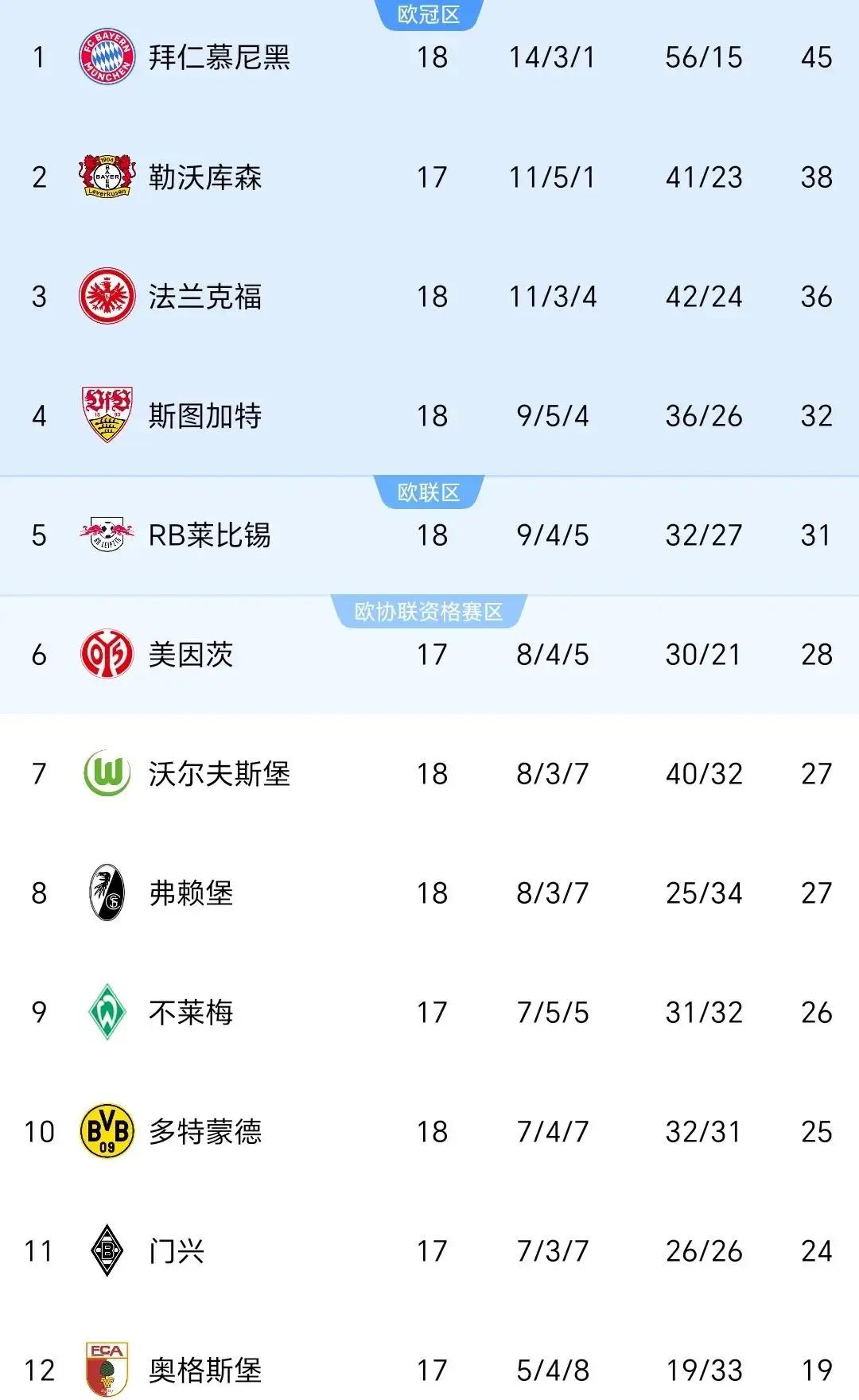 拜仁第1,莱比锡翻车第5,多特掉队下半区第1!