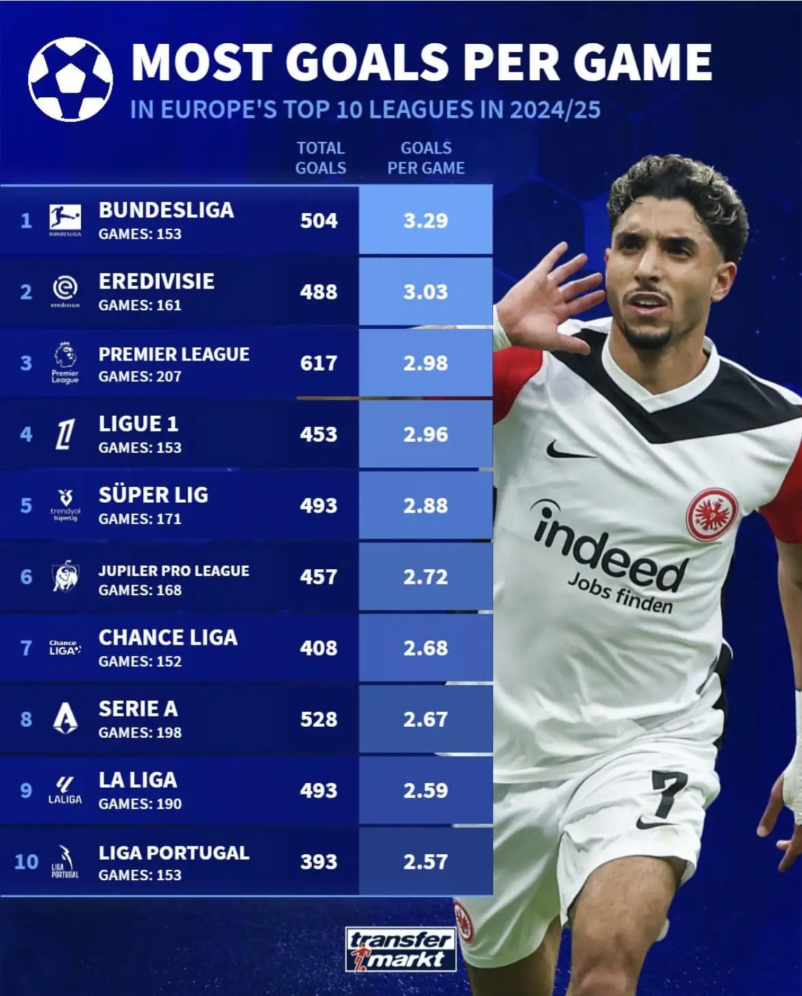 - 德甲(Bundesliga):总进球数 504,场均 3.29 个进球,排名第一。