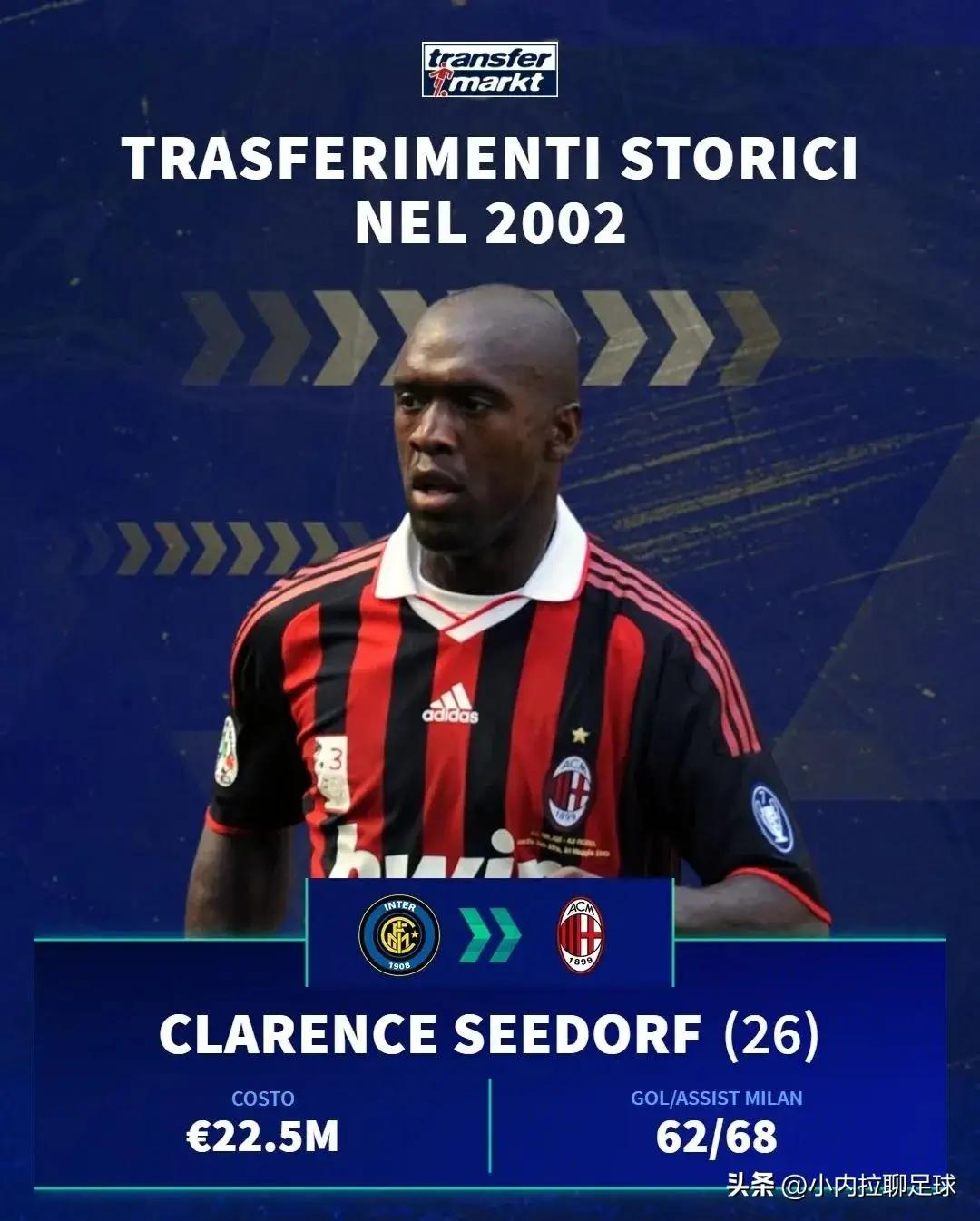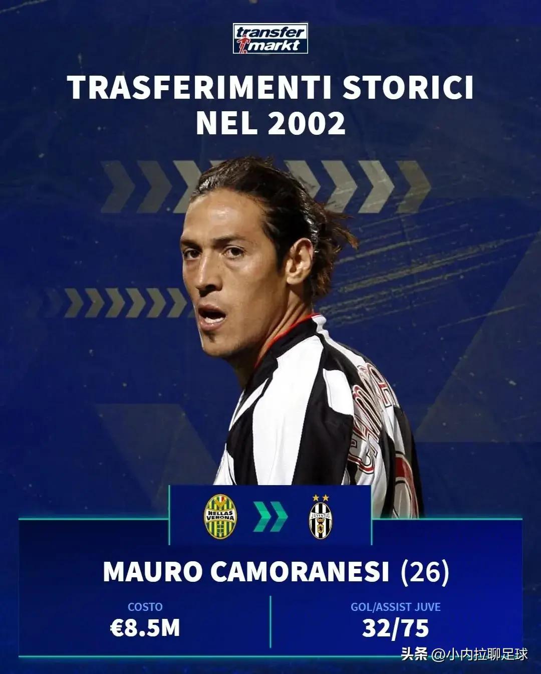 德国转会市场盘点了2002年意甲五大交易,球员平均年龄不到27岁,平均转会费高达2500万欧!要知道这可是23年前啊!这些转会费相当于现在的多少啊?1亿欧吧?!