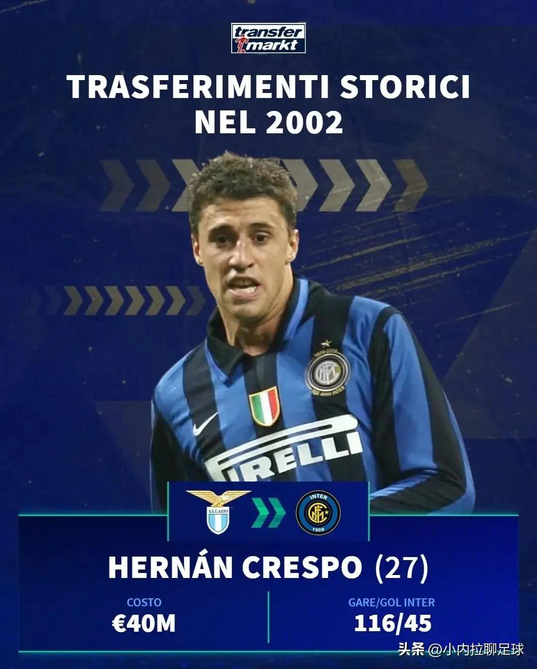 时年27岁的克雷斯波从拉齐奥来到国际米兰,“蓝黑军团”为此重金花费4000万欧!但仅短短一个赛季后,就去到了英超切尔西(转会费2600万欧),同样在蓝军仅一个赛季,2004年夏又租借至AC米兰一年,06年又租借回了国际米兰两年,终于在08年租借期满后以免签方式留在蓝黑军团,又双叒叕是一个赛季过后,09年去了热那亚,10年回到了意甲处子球队帕尔马,最后在2012年退役。