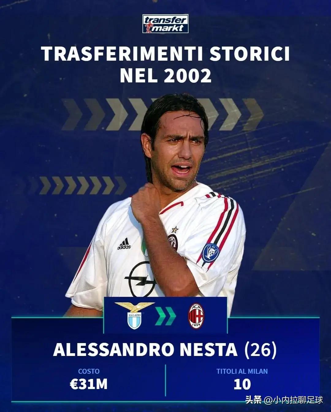 AC米兰花费3100万欧转会费,将时年26岁出自拉齐奥青训的内斯塔收入囊中;此后10个赛季,他一直在AC米兰效力,总共出场326次,打入10粒进球;在12年夏天离开意甲,登陆美职联,一个赛季后短暂退役,14年底再次复出,最终2015年在印度球队钦奈正式退役。