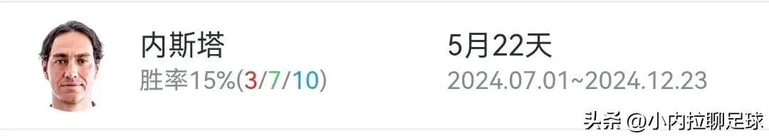 新赛季开始,一直到下课,5个月22天,20场比赛,交出3胜7平10负的糟糕战绩,胜率仅有可怜的15%……