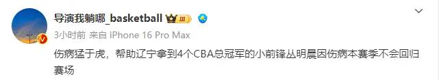 辽宁男篮本赛季锋线轮换非常紧张,因为张镇麟和丛明晨两大核心因伤缺阵,杨鸣指导一度到了无人可用的境地。据媒体人“导演我躺哪”透露:“伤病猛于虎,帮助辽宁拿到4个CBA总冠军的小前锋丛明晨因伤病本赛季不会回归赛场。”本赛季,丛明晨因伤一场未打,一直处于养伤阶段,这也是辽宁男篮锋线实力下滑的主要原因,丛明晨这个外线得分点赛季报销,对于辽宁男篮战术体系影响非常大。