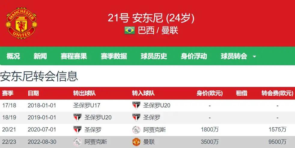安东尼出自巴西圣保罗青训,球员于2020年夏窗以1575万欧元的转会费从圣保罗加盟阿贾克斯,并快速成为球队主力以及巴西国脚,球员于2022年夏窗以9500万欧元+500万欧元浮动的转会费转投曼联。安东尼曼联生涯是低开低走,除了高的转会费和薪资,剩余一切都是低谷。安东尼加盟曼联时身价就只有3500万欧元,曼联花费9500万欧元购买,这就是一笔很浮夸的转会。如今安东尼身价已经跌至2000万欧元,并完全踢不上了比赛。