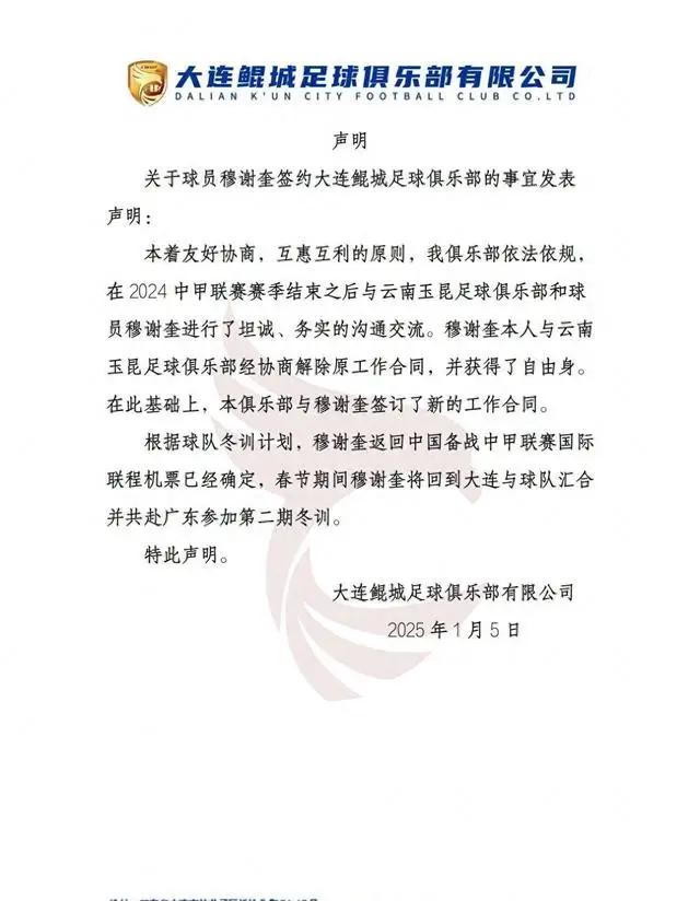 然而,就在大家还沉浸在“情怀”的时候,大连鲲城俱乐部当天发了个声明,标题是《关于球员穆谢奎签约大连鲲城足球俱乐部的事宜》。声明里说,上赛季中甲联赛结束后,俱乐部和穆谢奎按照法律和规定进行了沟通,穆谢奎也和云南玉昆俱乐部协商了解除原来的合同。