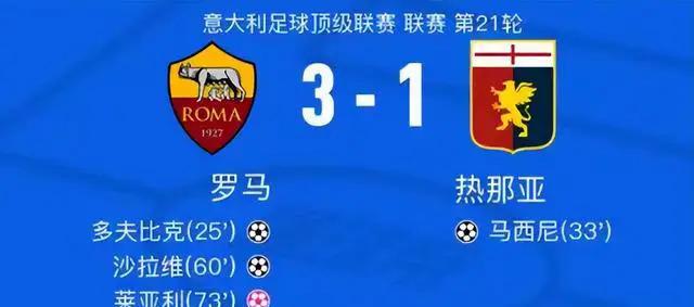 北京时间今天凌晨,意甲第21轮提前上演一场比赛,罗马主场迎战热那亚。上半场比赛以1-1平局结束,下半场迪巴拉助攻沙拉维在禁区死角射门得分,随后,迪巴拉又造成了对手门将莱亚利的乌龙球。最终罗马以3-1战胜热那亚。