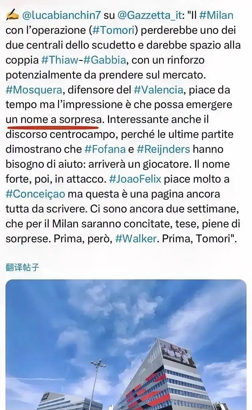 米兰会购买一名中后卫,当然前提是托莫里会离开,同时米兰在未来两周时间需要寻找适合米兰的中场和锋线球员。比安钦刻意强调了首先是托莫里。意思我好像理解了,如果没有托莫里离开,米兰冬季窗口只有沃克加盟球队。