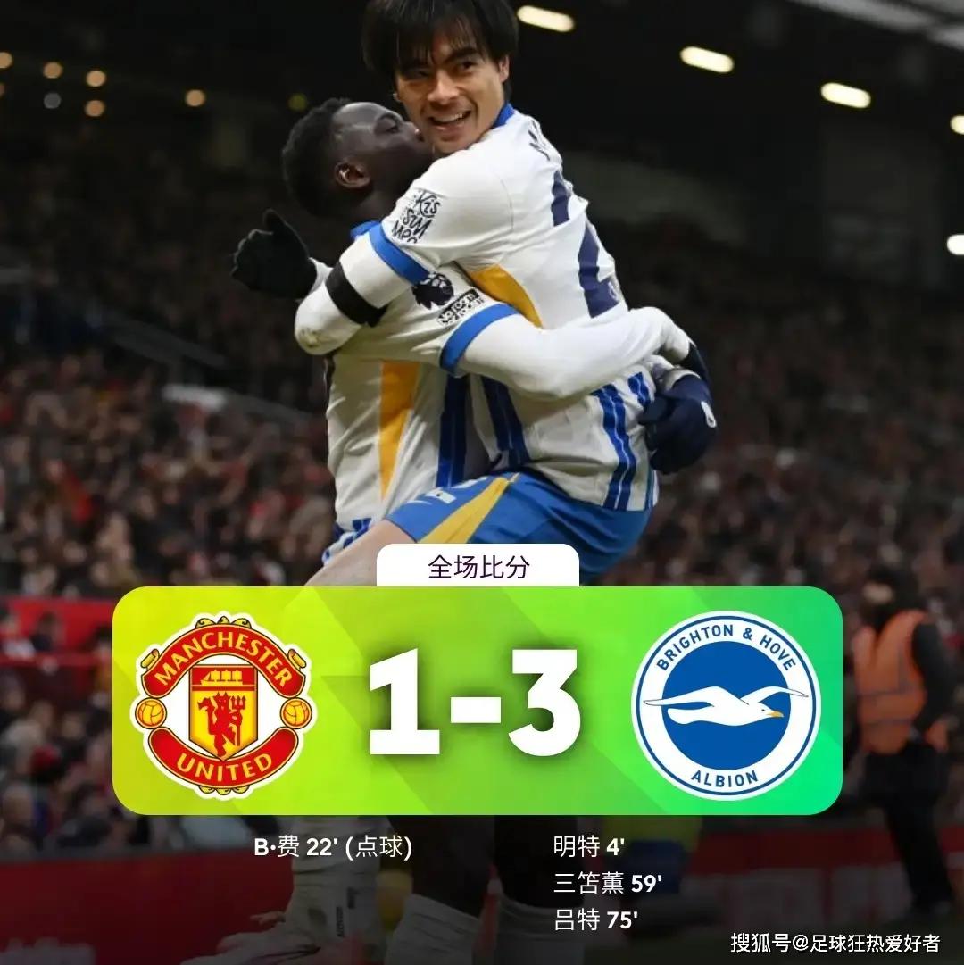 最终曼联主场1-3不敌布莱顿,本赛季遭对方双杀。