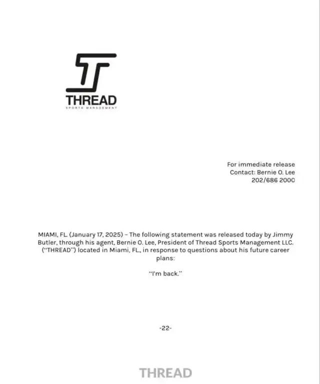值得一提的是,在忙于阵容升级的同时,赛场外也有许多话题。与热火闹掰且拒绝续约的吉米·巴特勒,在禁赛七场后发表简短声明,仅以“我回来了”四个字回应有关未来计划的询问,这种做法模仿了当年迈克尔·乔丹的复出宣言。对此,洛杉矶快船队的名记Farbod转发并公开嘲讽,认为这份声明毫无说服力,显得虚伪。本赛季,效力于热火的巴特勒在23场常规赛中场均贡献17.6分、5.4篮板和4.6助攻。巴特勒此举遭到船队讽刺,许多人认为这种做法失礼。