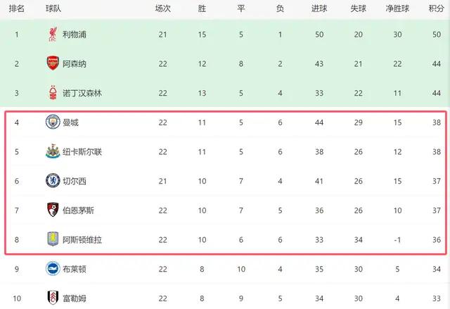 随着曼城获胜,英超争四又乱了。截至目前,从第四的曼城,到第8的维拉,这5支球队之间就差2分。虽然曼城已经打进前四,但是他们的位置并不稳固。本轮切尔西的比赛还没进行,如果他们能够在主场战胜狼队,这家英超豪门就将反超曼城,再度杀进前四。