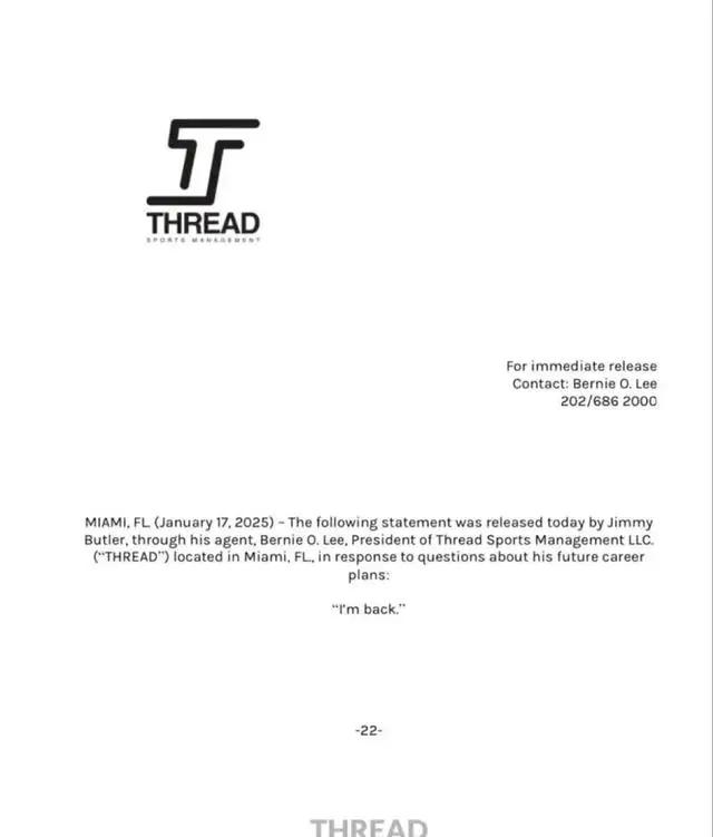 在积极筹划阵容升级的过程中,赛场之外同样热闹非凡。吉米·巴特勒与热火关系破裂,并拒绝了球队的续约提议。禁赛七场后,他简短地回复了一句“我回来了”,以此回应关于自己未来职业生涯的种种猜测。这一举动不禁让人联想到迈克尔·乔丹当年的经典复出宣言。然而,洛杉矶快船队的知名记者Farbod对此并不买账,他在社交媒体上转发并公开讽刺道,这样的声明毫无说服力,显得空洞无物。在2024-2025赛季,巴特勒为热火出战的23场常规赛中,场均贡献17.6分、5.4个篮板以及4.6次助攻。尽管他曾勇敢地站出来反对职场欺凌,但如今却遭到队友的冷嘲热讽,这让许多人为之惋惜,认为这种行为未免太过失礼。