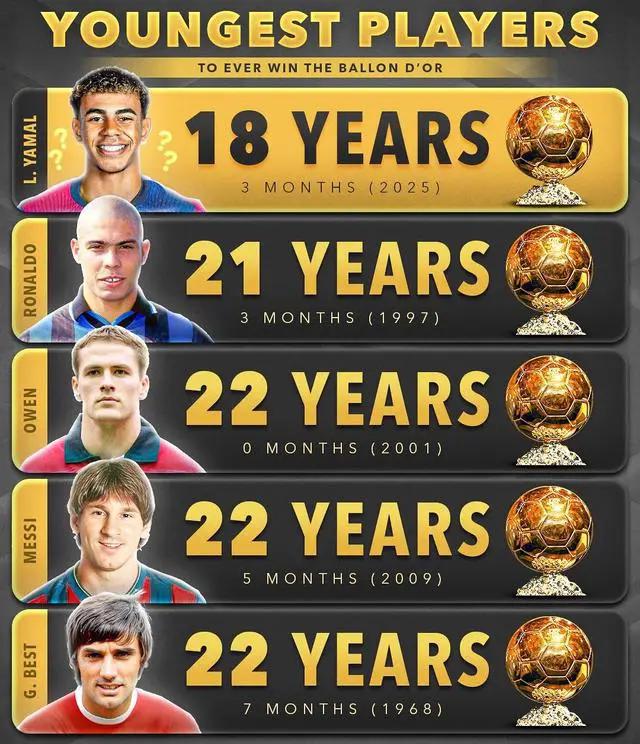 有很多人相信,在自己18岁的年纪,亚马尔有望成为足球史上最年轻的金球奖得主,将原有记录缩小整整3岁。