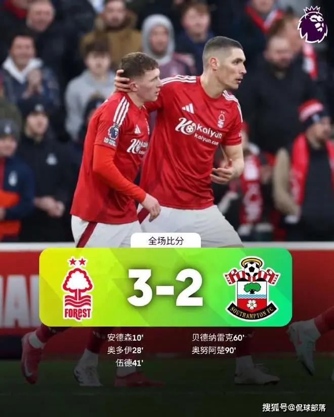 英超第22轮一场比赛,诺丁汉森林主场3-2险胜南安普顿,连续8轮联赛保持不败,取得7胜1平的战绩,积44分追平了阿森纳,因净胜球落后仍排第三,同时多赛一轮距离领头羊利物浦只差6分。
