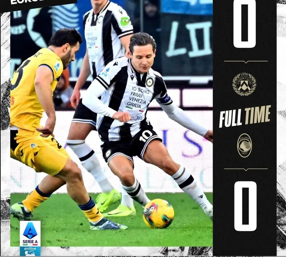 乌迪内斯在上轮意甲联赛中主场0-0战平亚特兰大遭遇三连平,他们在近四轮意甲保持不败。主力前锋卢卡停赛,乌迪内斯老将桑切斯本赛季第一次首发。乌迪内斯在比赛中占据优势,面对缺少了雷特吉的亚特兰大,乌迪内斯的进攻让对手疲于招架。从意大利超级杯归来的亚特兰大明显应对不足,托万的头球破门被卡尔内塞基扑出,桑切斯上半场连续射门击中亚特兰大门框。下半场亚特兰大换上从乌迪内斯加盟的萨马尔季奇,他贡献了女神当天下午最有威胁的射门。最终双方都无力攻破对方大门,各取一分。乌迪内斯战平后排名积分榜第十,落后第八的AC米兰五分。