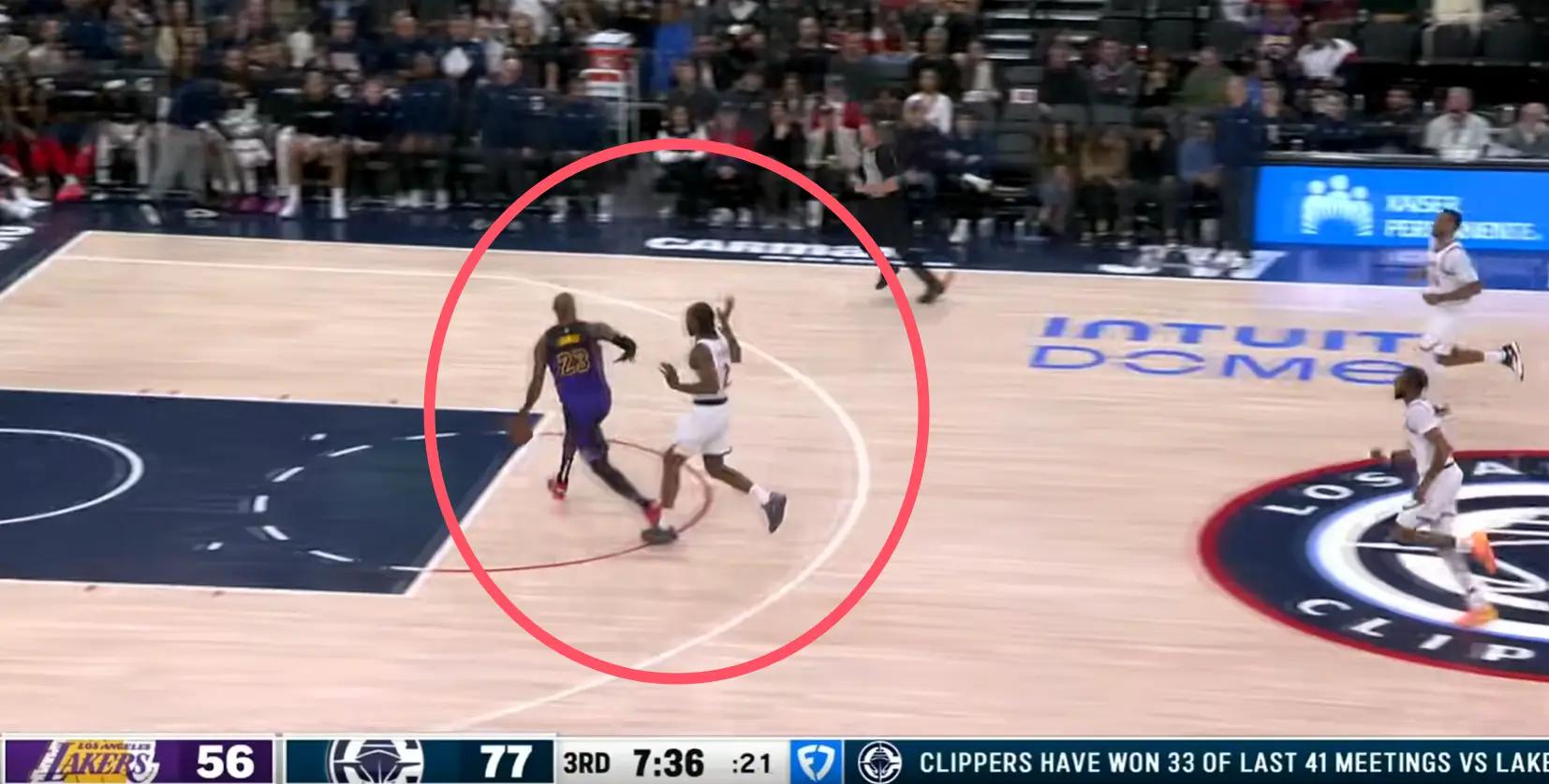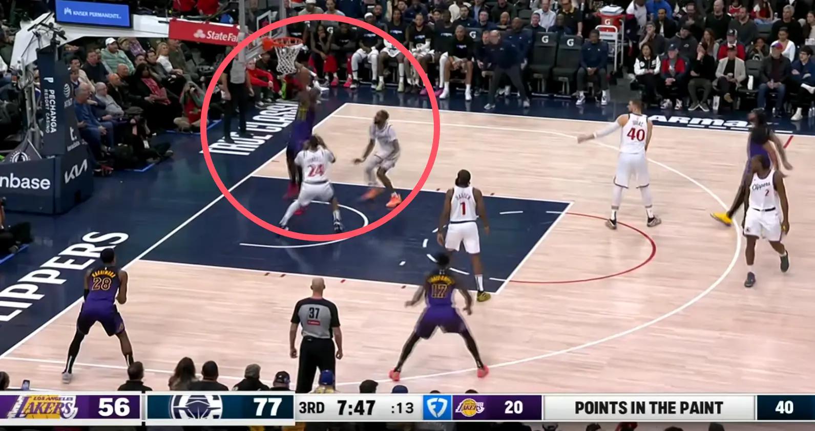 接下来一次回合,湖人直接出现了非常夸张的场面,四防五还真把快船给防下来了,而詹姆斯就站在快船半场,根本就不回防。他一看队友防下来立刻往前跑,果然此时队友把球甩到前场,他直接完成了一次无人防守的扣篮。