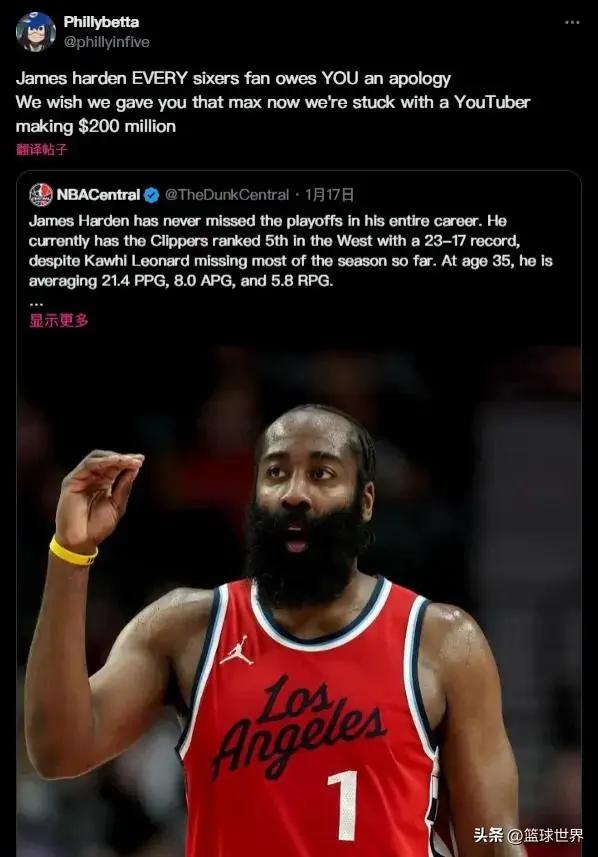 针对这条推特,费城自媒体Phillybetta转发时表示:“哈登,每个76人球迷都欠你一次道歉,真希望我们早些时候能给你顶薪,可现在我们被那个赚着2亿的油管博主困住了。”