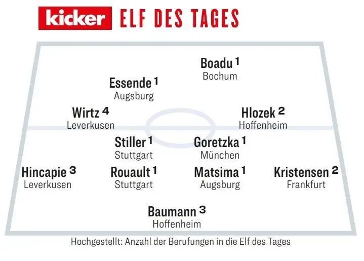 后卫:辛卡佩(勒沃库森)、鲁奥(斯图加特)、马西玛(奥格斯堡)、克里斯滕森(法兰克福)