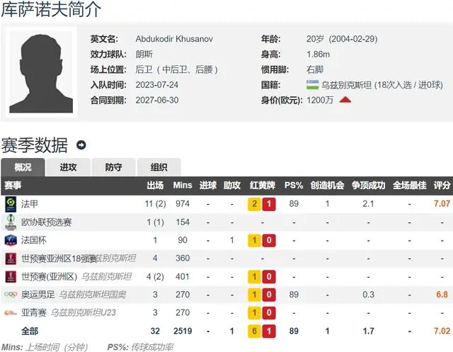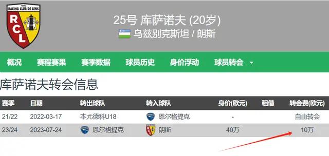 胡桑诺夫于2023年夏窗仅以10万欧元的转会费登陆欧洲五大联赛加盟法甲朗斯,培养了一年半之后,就卖了总价5000万欧元,只能说朗斯赚翻了。