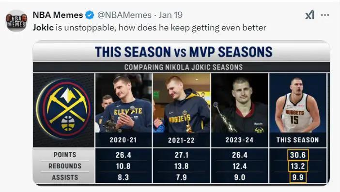 美国媒体还把乔丹1998年获得MVP的数据与约基奇本赛季的成绩进行了对比:乔丹的表现为28.7分、5.8个篮板、3.5次助攻、1.7次抢断、0.5个盖帽,命中率为46.5%,三分命中率23.8%。而约基奇目前的统计为30.4分、13.1个篮板、9.9次助攻、1.8次抢断和0.5个盖帽,命中率达55.8%,三分命中率更是高达47.1%。