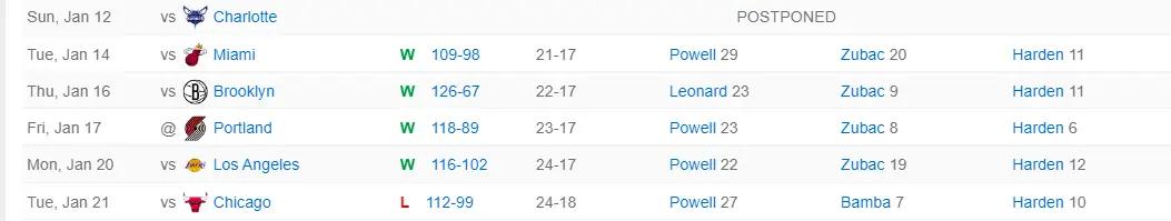 1月12日主场VS黄蜂的比赛延迟后,联盟重新安排了赛程,1月14日-1月21日这8天里快船打了5场比赛,而且16-17第一次背靠背,20-21第二次背靠背,8天打两次背靠背。