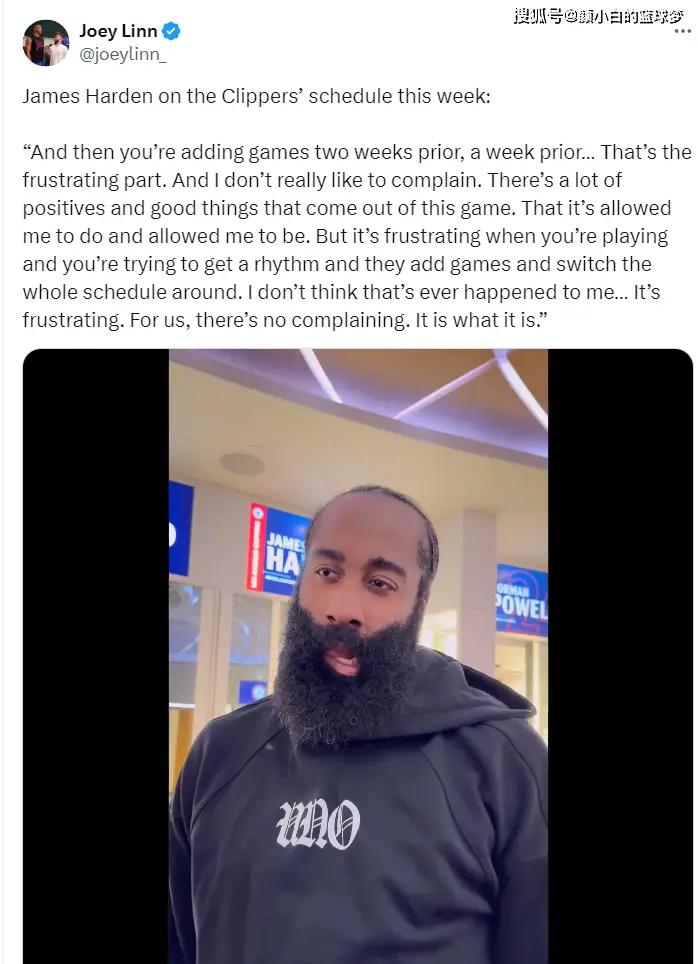 快船记者劳里-穆雷写道:哈登对快船本月的赛程感到失望,今晚就是重新安排的一场比赛,他们原本处于4连胜的状态,然后在4个不同的时区打了4场比赛,8天内打了第五场比赛。