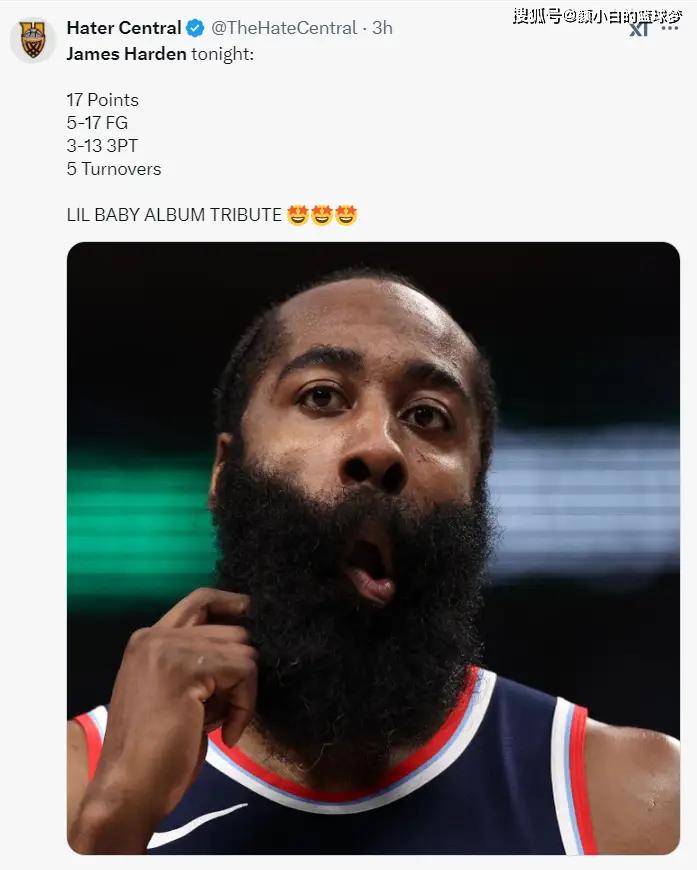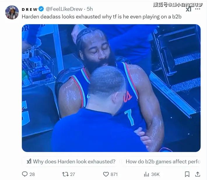 美媒Drew写道:从场边能看到哈登是如此的疲惫,为什么还要让一个老将出战背靠背第二场?