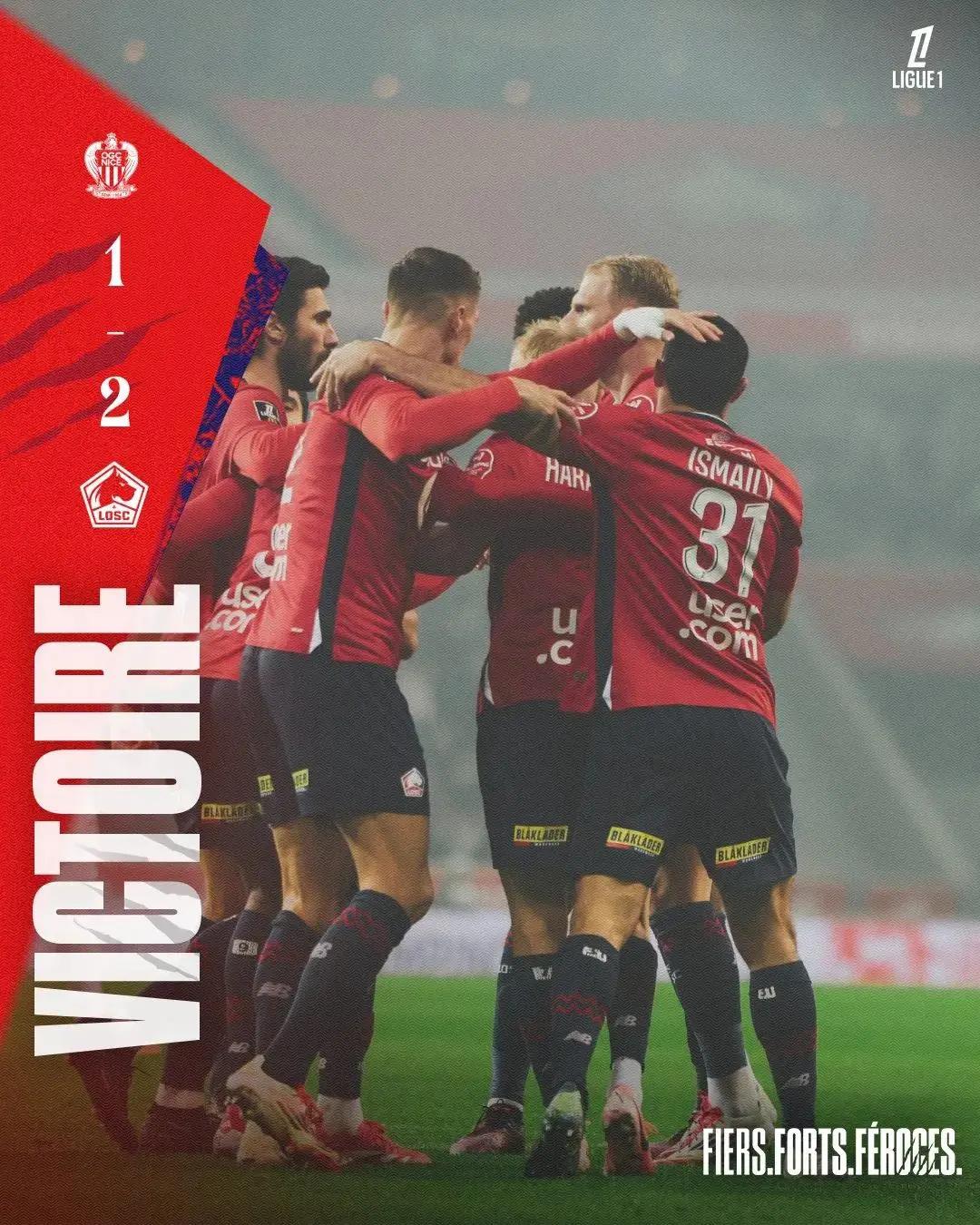 里尔在上周五的法甲联赛中主场2-1逆转尼斯取得各项赛事二十一场不败的惊人战绩,里尔在比赛中被尼斯率先进球,出生于法国的摩洛哥中场迪奥攻入本赛季第五球,上半场尼斯中场罗萨里奥因伤下场,替补登场的恩东贝莱上半场结束前射门击中横梁。下半场里尔调整战术,在战平欧塞尔的法甲联赛中错失大量机会的冰岛前锋哈拉尔德松扳平比分。随后里尔的角球造成尼斯禁区内兵荒马乱,中卫迪亚基特门前收获大礼轻松反超比分。里尔获胜后排名上升至第三,反超第四的摩纳哥一分。里尔目前在欧冠联赛中处于直接晋级十六强的位置,但他们需要在最后两轮中尽可能拿分才能确保直接出线。