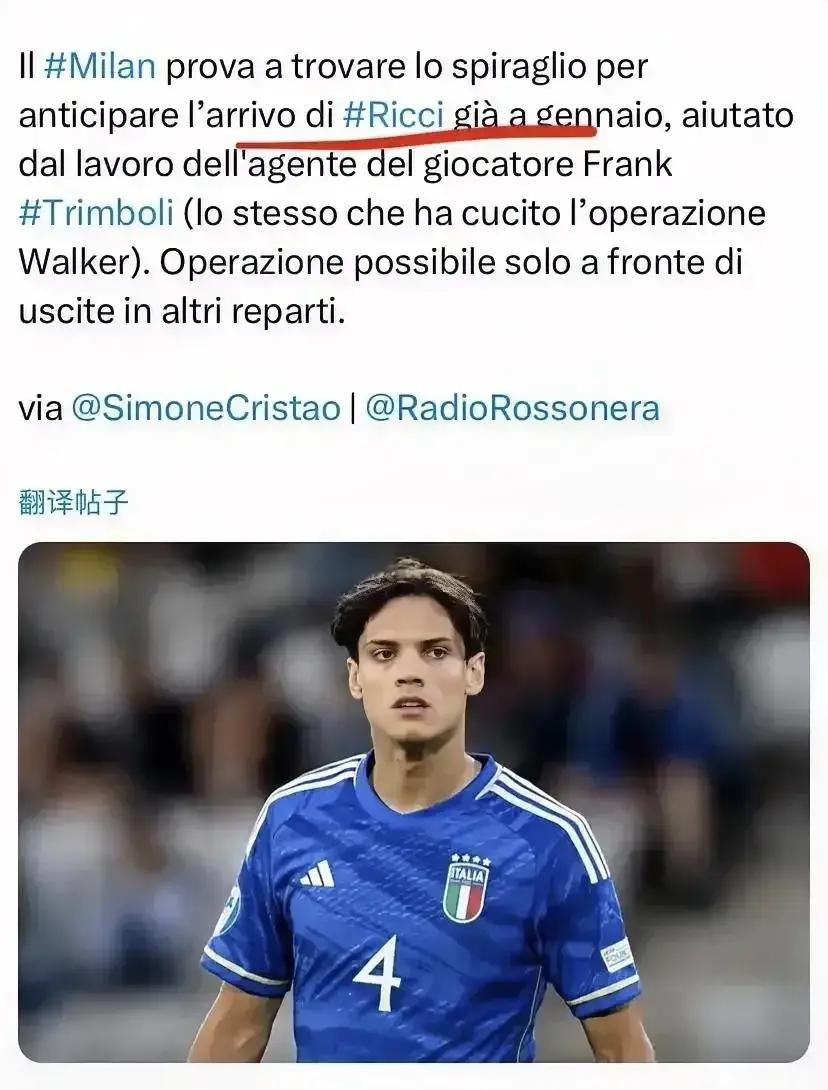 米兰将在球员经纪人弗兰克·特林博利(同时也在处理沃克交易的人)的帮助下,试图在一月份找到解决方案,引进塞缪尔·里奇。如果米兰不能参加欧冠,还有一种说法是米兰不能参加欧战,这还是有本质区别的,欧冠就是联赛前四,欧战联赛前六就可以满足。红鸟很可能会面临巨大的经济压力。