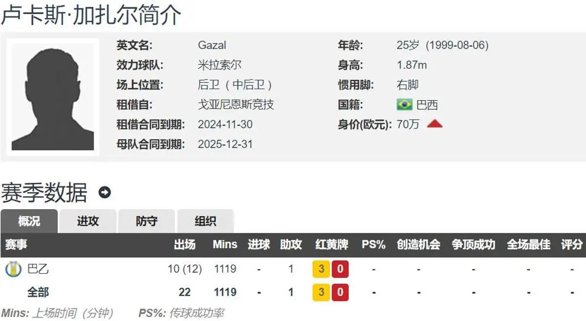 现年25岁的卢卡斯-加扎尔,身高达1.87米,是一名右脚后卫,擅长中卫位置。他的德转身价为70万欧元,与球队的合同将在今年年底到期,仅剩一年的时间。在过去的赛季里,加扎尔被租借到巴乙的米拉索尔俱乐部,共在联赛中出场22次,其中有10次是作为首发球员,总计上场时间达到1119分钟。